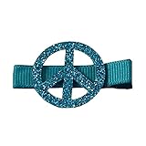 This fun clippie by Reflectionz is the perfect final touch to any outfit. This cute, small glitter peace sign clippie for your little girl has a turquoise grosgrain ribbon covering the alligator clip with a darling turquoise glittery peace sign appliqu'. The alligator hair clippie is approximately 1 3/4 inches wide and 1 inch long.
