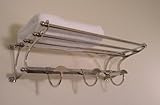 Brushed Nickel Towel Rack in the hotel or train rack style. It has a removeable Robe Hooks so the bottom can be a towel drying bar. Brushed Nickel Finish on steel construction. It is 20" wide by 8" high. It extends from the wall 9 3/4". Includes mounting instructions and screes. Email us if you need more information. Towel Rack with Sliding removeable Robe Hooks. Brushed Satin Nickel finish on steel construction. Overall 20" wide , by 8" high, extends out from wall 9 3/4". Comes with screws for mounting. Remove Hooks for Towel Drying Bar.